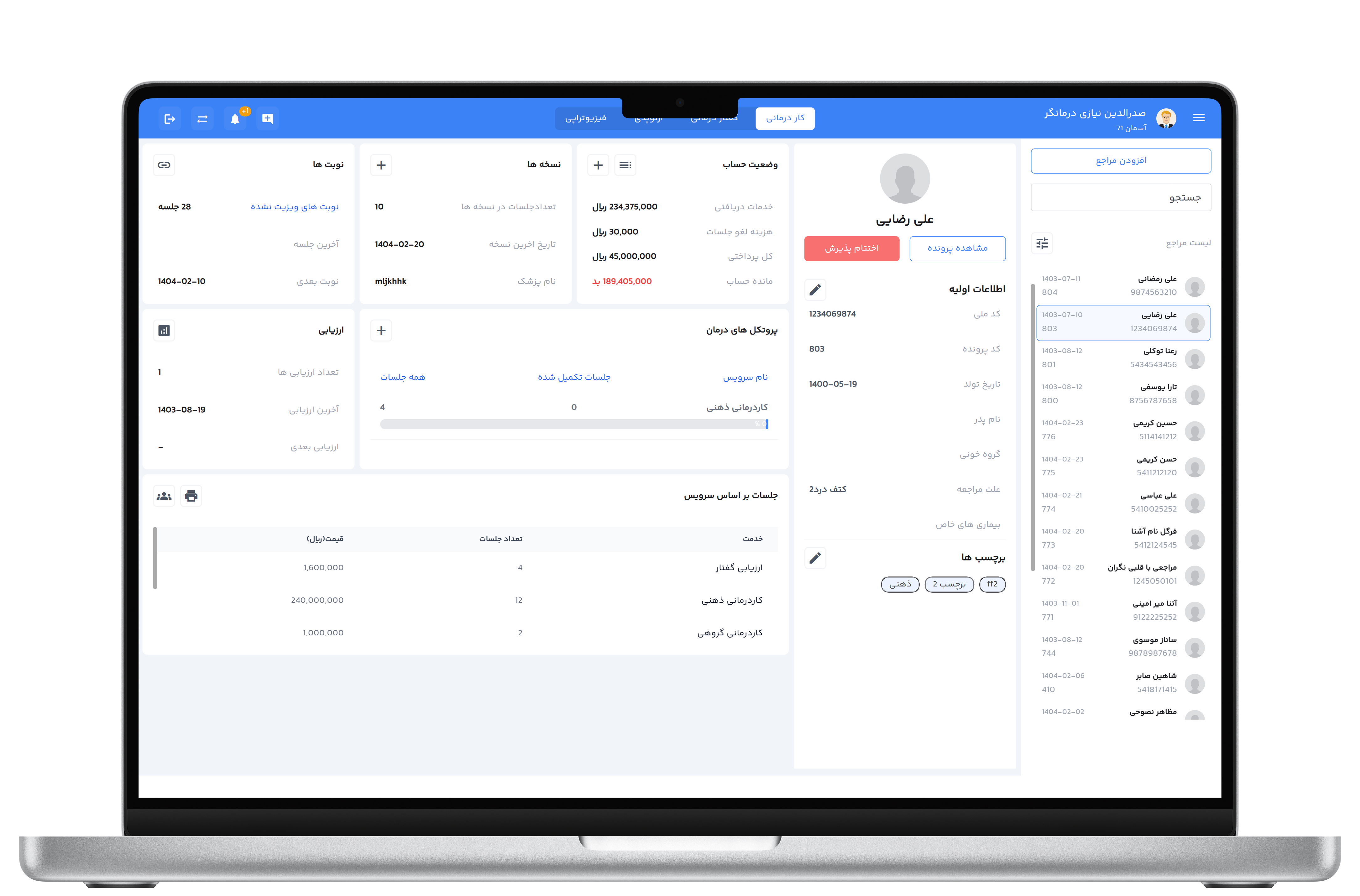 با استفاده از این پنل، تمامی امور به صورت یکپارچه و دقیق تحت کنترل قرار می گیرد؛ از تهیه گزارش های جامع گرفته تا نظارت بر عملکرد درمانگران و حتی مدیریت هم زمان چند مرکز درمانی.